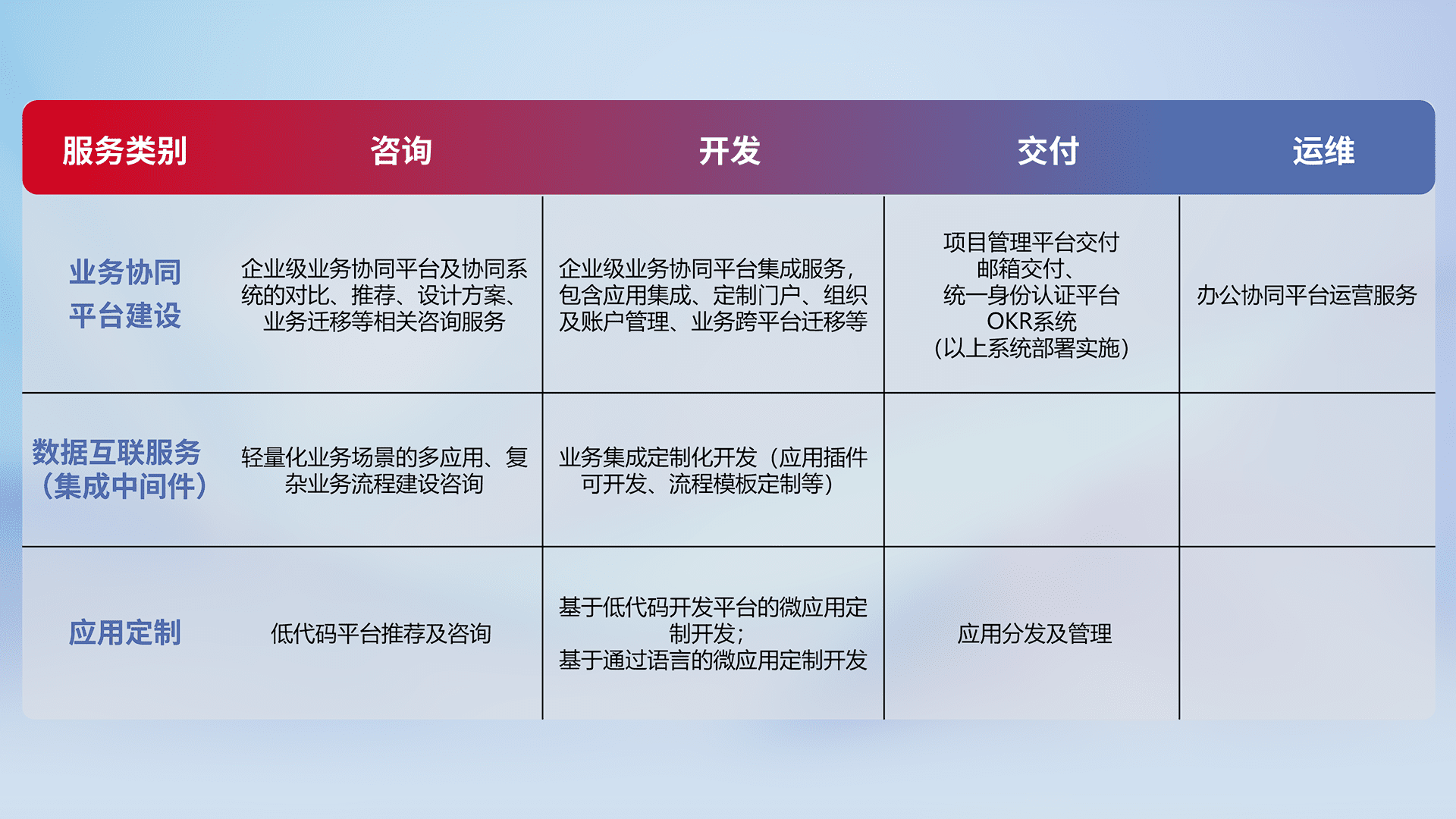针对钉钉、、企微、、、、IDaas等平台级产品提供产品的规划、、方案、、交付、、、定制化开发等服务,,,实现如统一协同办公、、、智能客户服务、、、混合会议管理、、、智能数据查询、、、、等业务场景,,,实现数字化转型。。。。