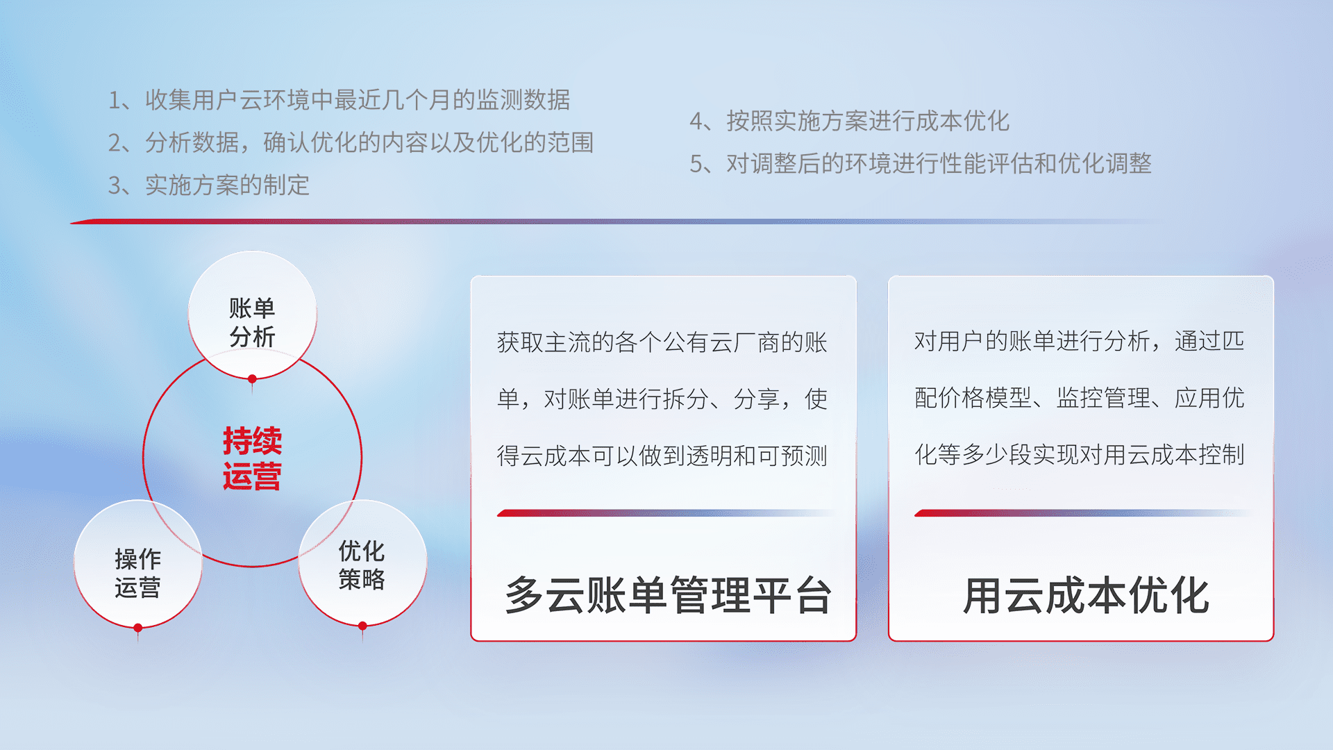 通过多云纳管,,以统一的资源数据模型把客户的云资源进行抽象和封装,,,,进而实现对多云资源的统一操作,,保障云资源管理的可靠性、、、稳定性与可用性。。量身定制化运维内容,,,配置、、开发运维、、补丁管理、、备份、、、、监控、、、、认证和访问管理、、审计和日常巡检等,,,保障在用云过程中的可靠度,,稳定度以及高可用率。。。。
